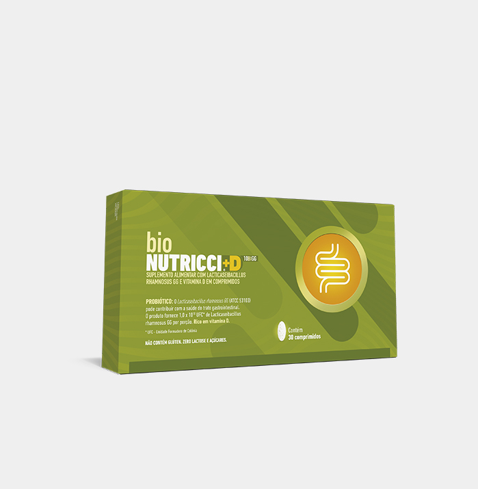 Bio Nutricci + D é um suplemento alimentar com Lacticaseibacillus Rhamnosus GG rico em Vitamina D que auxilia sinergicamente a saúde gastrointestinal1. LGG + Vitamina D aumentam a expressão do receptor VDR e promove a melhor proliferação epitelial colônica.1 Bio Nutricci + D auxilia na melhora dos distúrbios gastrointestinais funcionais relacionados com dor abdominal, por exemplo.1-3