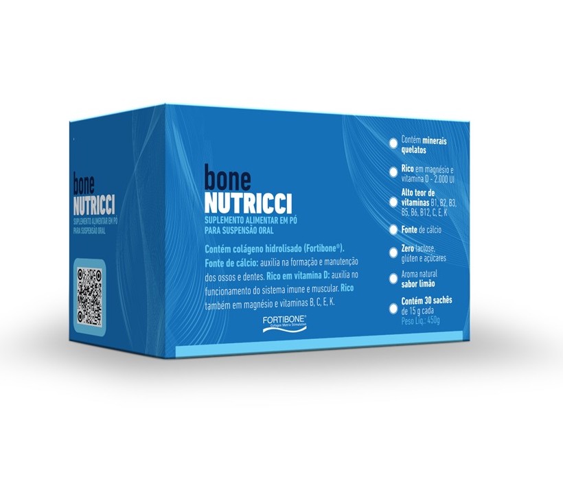- Bone Nutricci é o único suplemento alimentar com foco na saúde óssea que apresenta o FORTIBONE® em sua composição e também metilfolato e vitaminas B1,B2, 3, B5, B6 e B12. Além disso, apresenta minerais quelatos em sua composição e alto teor de vitamina D. Ainda se destaca por oferecer em sua fórmula a combinação-chave para o cuidado ósseo: vitamina D +cálcio + magnésio + vitamina K.